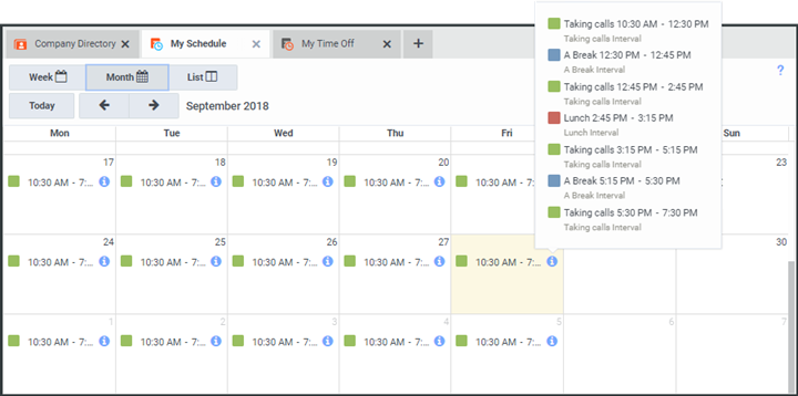 The Schedule Month view displays the start and end times for your shift on each day. To display schedule details for a selected day, click the information icon in the selected day.