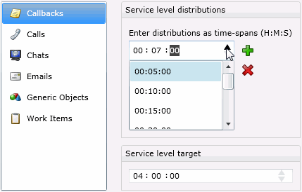 To specify a queue service level, select the interaction type, and use the up and down arrow or type a number for the Service level distribution.