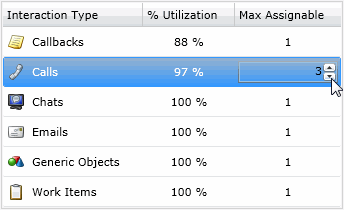 To set the interaction type's % Utilization and Max Assignable for each Interaction Type, use the arrows or type the number.