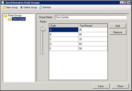 Click Save, and then click Close to exit the Questionnaires Rank Group dialog.