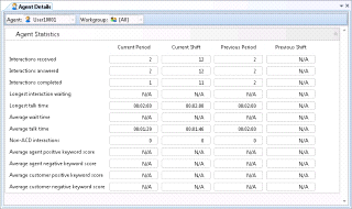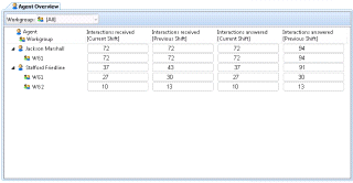 Summarizes the activity of a single agent, for a single workgroup, or for all workgroups that the agent has membership in. This view displays Agent Statistics for the current period, previous period, current shift and previous shift. |