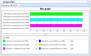 Shows statistics of several agents in one or more workgroups presented in a graph. This view displays Agent Statistics for the current period, previous period, current shift and previous shift. |