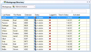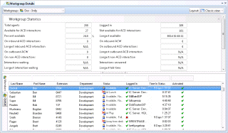 Statistics of several agents in one or more workgroups. Statistics for each agent can be expanded to show activity in workgroup queues.