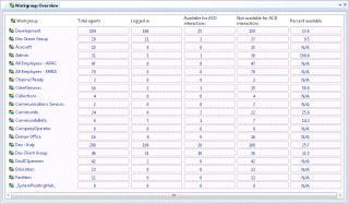 Compares activity of multiple workgroups. This view rolls up statistics for selected workgroups, displaying workgroups selected by the user as rows, and selected workgroup statistics as columns. |