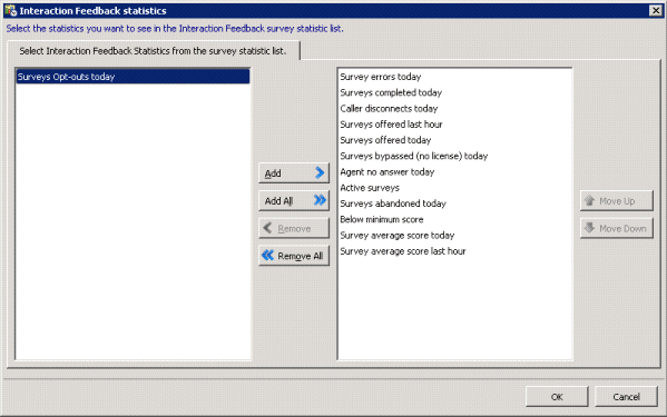 The Interaction Feedback Statistics dialog appears when users of an Interaction Feedback Statistics view right-click a statistic to display the shortcut menu, and then select Add/Remove statistics. This dialog modifies the selection of statistics displayed in the view.