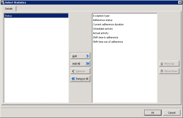 Use this dialog to change the selection of statistics displayed in the Real Time Adherence view.