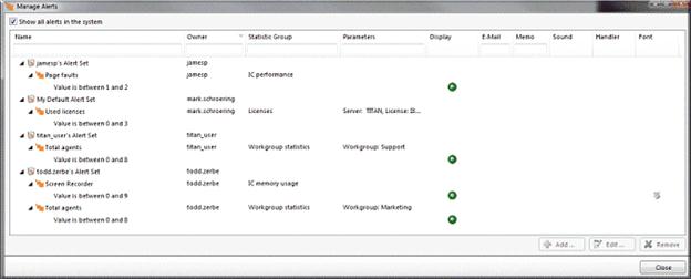 Interaction Supervisor provides a command that helps users administer all of their alerts in one dialog. The user can view alerts they have set up, edit, and remove alerts. Users can optionally see all alerts in the system, including alerts set by other users.