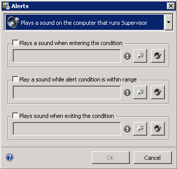 Use this dialog to play sounds when the value of the statistic enters the range of a condition, changes within the condition, or exits the range of a condition. For each option, you can type or select the full path to a recording, or listen to the sound file.
