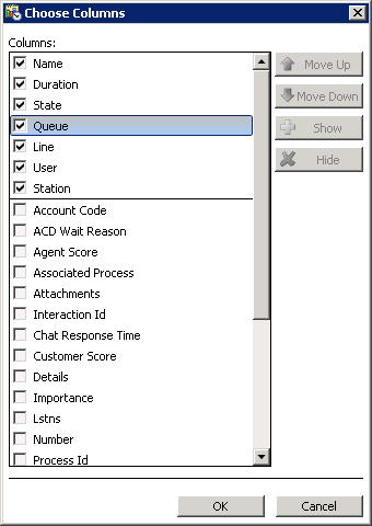 Use the Queue Columns Selection dialog to select queue columns to display in a view, and to optionally set their order of appearance in a view.