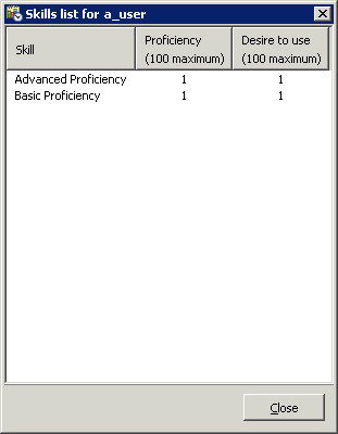 The Skills List dialog displays skills associated with a workgroup user, along with the proficiency and desire to use each skill. To display this dialog, right click a user row in a Workgroup Directory control. Then select Display skill set.