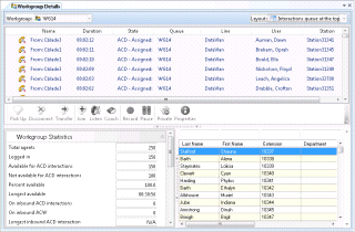A Workgroup Details view displays details about a selected workgroup. It displays the status of individual workgroup members, including the length of time in status and their logged in state. It shows workgroup statistics, members of the workgroup directory, and if applicable, interactions in the workgroup queue.