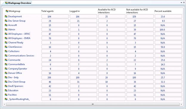 A Workgroup Overview compares activity of multiple workgroups. This view rolls up statistics for selected workgroups, displaying workgroups selected by the user as rows, and selected workgroup statistics as columns. Clicking on a column header sorts by that column. Columns can be re-ordered, except for the first column. The column order that you select will remain the same, even if you add or remove workgroups to this view.
