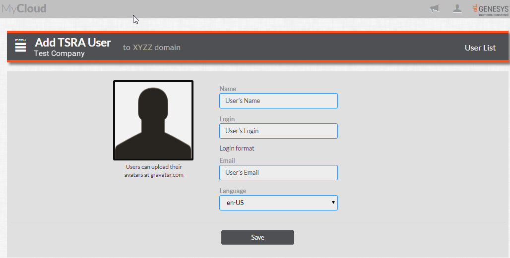 Enter the TSRA User form data according to the TSRA user's information in Interaction Administrator, in the User container, on the Configuration tab. The Login field for the TSRA User must include the NT Domain User field data from Interaction Administrator. Click Save to complete the account.