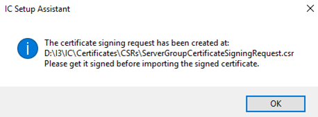 7. Click Create. IC Setup Assistant displays a message to indicate that you successfully created the request. The File Path field indicates the path to the certificate signing request file and the private key.