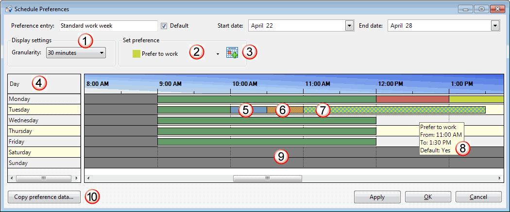 You use the Schedule Preferences Details dialog box to define your schedule preferences. You use pre-defined work preference types to describe your preferred schedule and indicate these work preferences in fixed intervals. An interval can be as short as fifteen minutes or as long as you require.