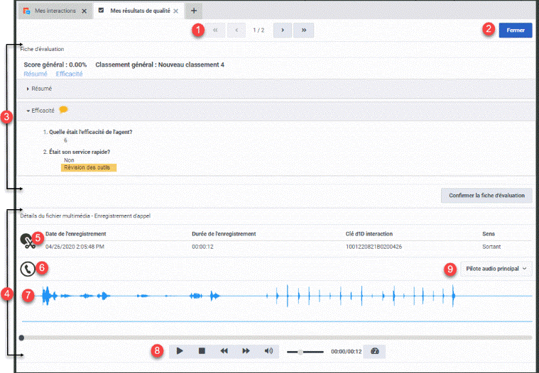 Vous pouvez confirmer la réception d'une fiche d'évaluation et examiner un enregistrement dans la fiche d'évaluation relative aux appels.