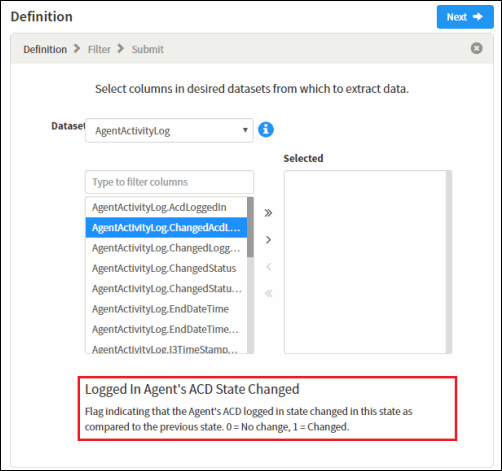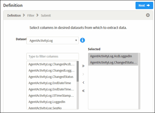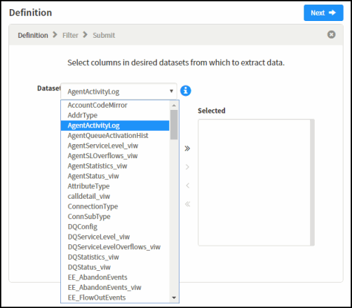 1. On the Definition page, select a dataset from which you want to extract data. Datasets are tables or views in the CIC database.