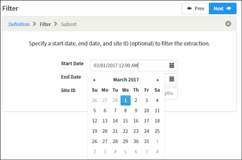 3. On the Filter page, define the interval DateTime for the data you are extracting, if applicable.