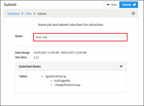 2. On the Submit page, review your job configuration. You can click on Selected Items to review selected datasets and columns.