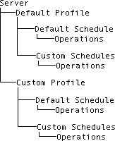 Attendant enforces a hierarchical relationship between nodes in the tree. It uses simple rules to determine the order of items, and the options that are available in menus and toolbars. The figure below shows the relationship between servers, profiles, schedules, and operations. The basic structure is: Server > Profile > Schedule > Operation.