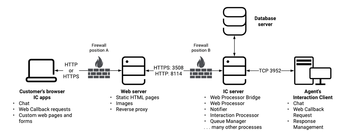 The web server runs Microsoft IIS or other compatible web server software and connects to the CIC server over port 3508 (HTTPS) and 8114 (HTTP). The default port numbers are 3508 and 8114, but you can configure other port numbers. You can enable either HTTPS or HTTP or both.
