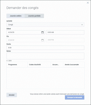 Remarque : vous ne pouvez pas modifier les informations du tableau Programme. Ce tableau vous permet de vérifier combien de congés vous avez accumulés.