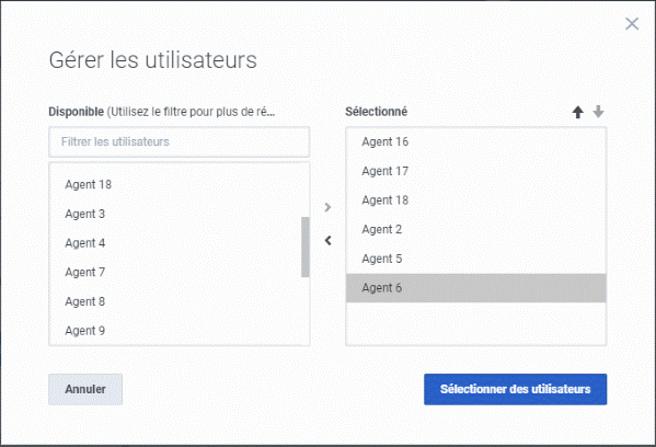 Lorsque la liste Sélectionnés contient les noms des files d'attente d'utilisateurs à surveiller, cliquez sur Sélectionner des utilisateurs.