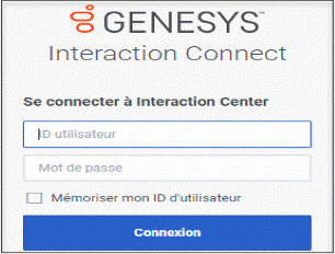 • Si vous avez sélectionné Authentification d'Interaction Center, entrez votre ID utilisateur et mot de passe CIC comme configuré dans Interaction Administrator. Cliquez sur Connexion.