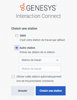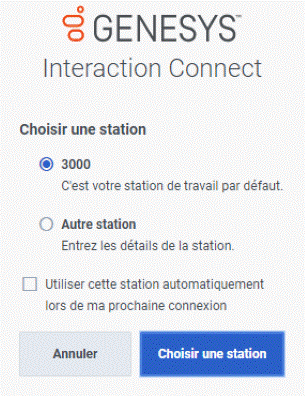 Sélectionnez Aucune station si vous traitez uniquement des interactions n'ayant pas besoin de station (tels que les chats et les emails) ou si vous avez besoin uniquement de fonctionnalités d'administration et de superviseur dans Interaction Connect. Pour plus d'informations, consultez la rubrique Connexion sans station.