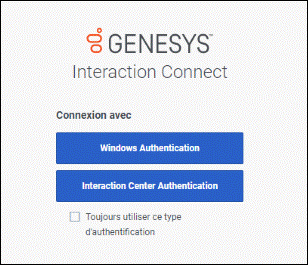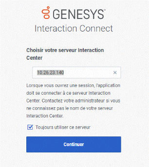 Astuce : si votre administrateur CIC a activé l'authentification unique et que vous cochez la case Toujours utiliser ce serveur, vous vous reconnectez automatiquement chaque fois que vous ne vous déconnectez pas d'Interaction Connect, mais que vous vous contentez de fermer et de rouvrir votre navigateur.