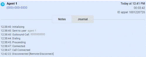 Dans l'Historique des appels, sélectionnez une interaction et cliquez sur le bouton Propriétés. Pour sélectionner les propriétés des interactions à afficher, cliquez sur Notes ou Journal.