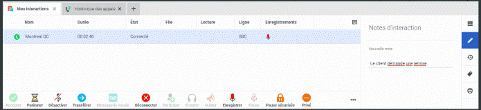 Vous pouvez afficher des informations complètes sur une interaction terminée ou prendre des notes pendant l'interaction.