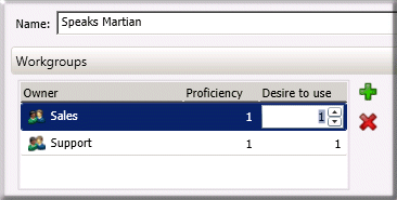 Click to edit the Desire to use columns for each workgroup. Desire to Use is also a number between 0 and 100, to indicate how willing the workgroup is to use the skill. For example, all agents may have a high level of proficiency with a particular skill (such as technical support) but may have very little desire to use that skill in an ACD environment. Higher numbers indicate greater desire to use this skill.