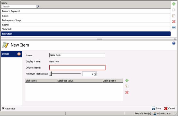 As a general rule, all dialing ratios should be equal. For this reason, the dialing ratio always defaults to 1. Similar to a pace setting of 0, this puts Dialer in complete control of calculating when to dial calls for each skill requirement. But, adjusting dialing ratios allows for greater precision when configuring skills-based dialing. One use of the Dialing Ratio would be to assign 1 skill per sub-list (e.g. client A), give all agents all skills related to all lists, and then tweak the Dialing Ratios to get through 1 sub-list faster than another.