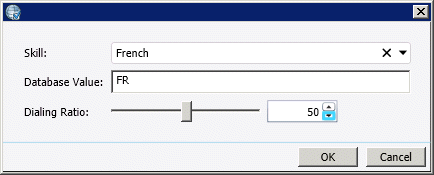 Use the Dialing Ratio slider to indicate preference to require a skill. It skews the relative number of calls that will be placed for each skill. For example, if the dialing ratio is 2 for skill A, and 1 for skill B, then Dialer will call twice as many skill A's as skill B's.