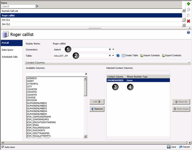 A contact list entry also defines which phone number columns that should be dialed (3) and the type of telephone number (4).Phone Number Types are user-defined strings associated with contact columns to identify a type of telephone number. Examples of phone number types might be "Work", "Home", or "Cell". Phone number types describe the purpose of phone numbers columns in a contact list. Phone number types are centrally defined in the Global Dialer Settings view, so that they can be assigned to any contact list object. See Define Phone Number Types and Associate a phone number column with a phone number type.