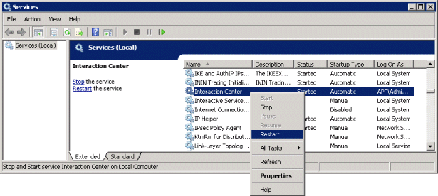 Scroll down to Interaction Center. Right click Interaction Center and select "Restart".