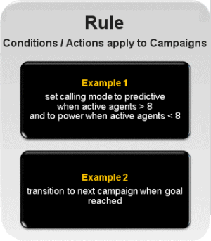 Rules Rules evaluate conditions to determine whether to carry out an action that affects the processing of a campaign. The conditions of a rule can reference system statistics, time of day, and events that occur in the system, such as a call list being recycled or a campaign starting. Rule actions affect the processing of a campaign. For example, Actions can pause a campaign, recycle its contact list, change the dialing mode, apply a filter, log agents out of the campaign and into a different one, send an Email, run a handler, pass control to a different set of rules, and more. Rules are grouped into Rule Sets which can be assigned to multiple campaigns as needed. |