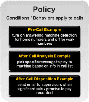 Policies Policies evaluate conditions that in turn, apply behaviors to the processing of individual contact records. Each behavior affects the processing of an individual contact. For example, a behavior might prevent a contact from being dialed, or require that the call is routed to an agent who has a specific skill set. Policies can be evaluated before the call is placed (pre-call), after call analysis, or after the call is dispositioned. Policies are grouped into Policy Sets which can be assigned to multiple campaigns as needed. |