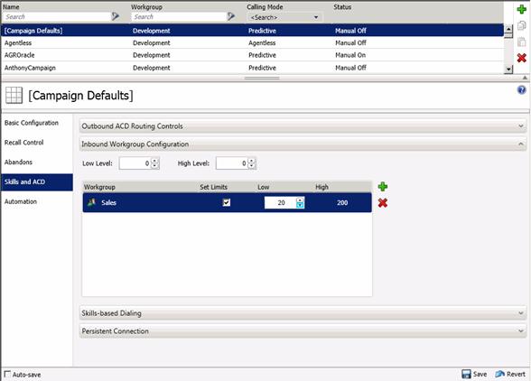 On the Skills and ACD tab in the Campaign configuration in Interaction Administrator, inbound workgroups can be specified for monitoring by Dialer. If the volume in one or more of these workgroups exceeds a specified maximum, Dialer will slow down dialing to allow for these calls to be handled by the blended agents.