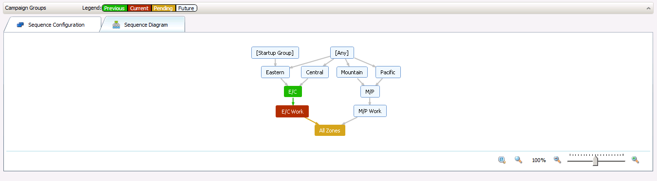 A Sequence Diagram is essentially a flowchart that graphically shows the organization of a campaign sequence and is designed to help you visualize your campaign sequence as it is running. When you select the Sequence Diagram tab, you'll see that each item in the sequence is represented with a node displaying the campaign group name. Arrows representing the configured campaign transition connect each node. Color coding and tool tips aid in the visualization and understanding of how of the campaign sequence is working as it runs. As the campaign sequence runs, the system will update the sequence diagram in real time allowing you to monitor the campaign while it is running.