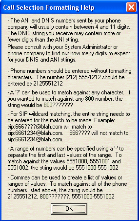 This dialog appears when the Formatting Help button is pressed on a call profile form. It displays tips for using wildcards and for entering ranges in fields that filter a profile based upon DNIS or ANI values. When you are finished, press OK to dismiss the dialog.