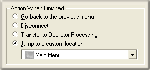 These options set the processing that occurs after the operation completes successfully, when flow of control leaves this node. You can return control to the previous menu, disconnect the call, transfer to an operator profile, or jump to any node or action that has been defined for the current server. In most cases you will want to transfer control to another menu, as shown in the figure below.