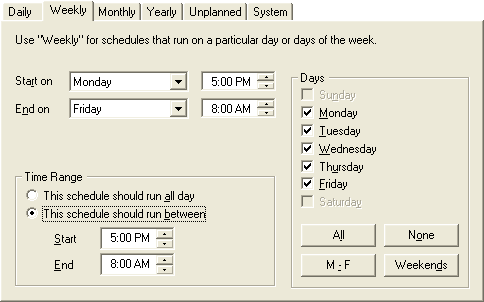 The example schedule below is designed to run during a typical workweek, 8 AM to 5 PM each day, Monday through Friday.