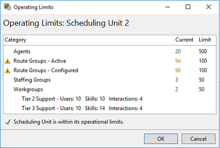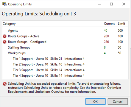 For more information about operating limits and modifying a scheduling unit that exceeds operating limits, see Interaction Optimizer configuration scale in the Interaction Optimizer Requirements and Limitation Technical Reference.