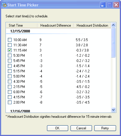 The Start Time Picker dialog box appears if the Show all feasible scheduling times for dates selected option is selected when scheduling a group activity. The resulting headcount differences between the forecast and scheduled agents for each date selected is displayed: