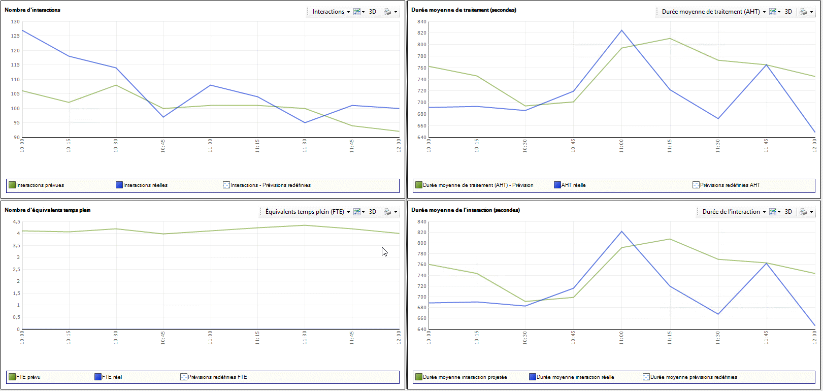 Affichez les données de l'analyse Intraday dans les graphes affichés. Par défaut, les données du nombre d'interactions, de la durée moyenne de traitement (AHT) en secondes, du nombre d'équivalents temps plein (FTE) et du temps d'interaction moyen en secondes, sont affichées dans quatre graphes linéaires à deux dimensions (voir Définir les options d'affichage des onglets de graphes pour modifier l'affichage).