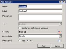 Right-click a blank area of the Variables workspace, point to Add, and click Boolean in the shortcut menu.
