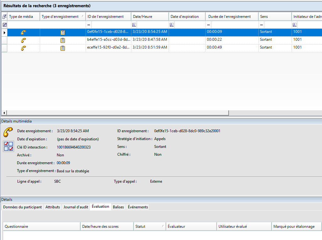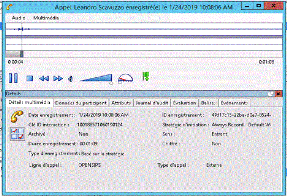 Selon le type d'interaction, le lecteur multimédia est lancé, affichant les détails de l'enregistrement. Voici un exemple de lecture audio. Les détails de l'interaction sont affichés dans la fenêtre Lecture.