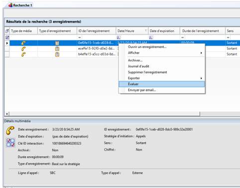 Pour sauvegarder une interaction évaluée à envoyer par email ou pour terminer l’évaluation plus tard, cliquez sur Sauvegarder.